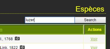 -Vous pouvez rechercher rapidement une espèce via la boite de dialogue “Search”. La recherche peut se faire en latin, français, anglais, allemand ou espagnol pour les noms principaux ainsi que les synonymes.