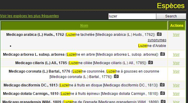 – Le site affiche alors la liste des espèces contenant le mot recherché.