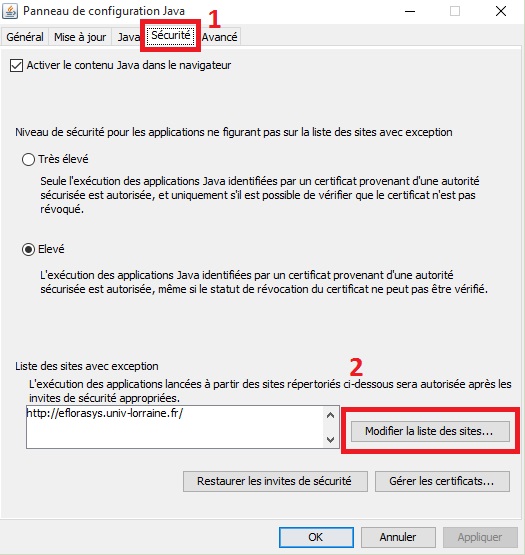 Dans le panneau de configuration, aller ensuite dans l’onglet “Sécurité“. Aller dans la “Liste des sites avec exception” et cliquer sur “Modifier la liste des sites…”