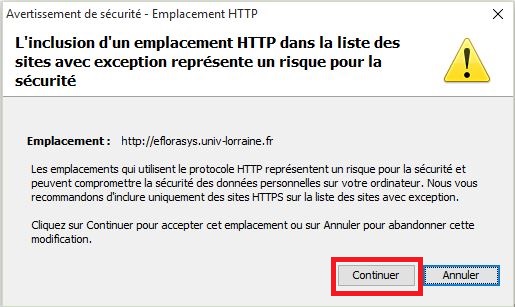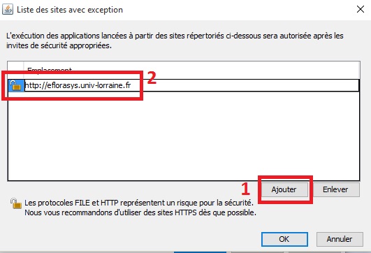 Cliquer sur “Ajouter” puis saisir l’adresse du site (http://eflorasys.univ-lorraine.fr) dans l’emplacement réservé.
