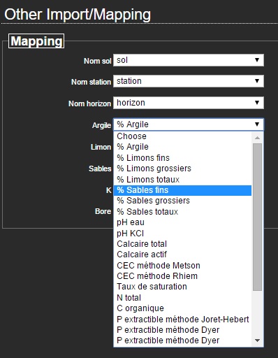 – L’importation d’un nouveau sol se fait par la méthode de ‘Mapping’. Les noms de la colonne de gauche correspondent aux champs du fichier d’importation. Sélectionner dans la colonne de droite, en utilisant les listes déroulantes, les champs e-FLORA-sys auxquels ils seront attribués.