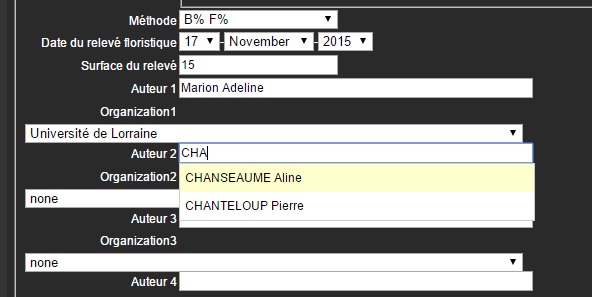 6. Indiquer le ou les auteur(s) du relevé. La saisie d’un auteur se fait de façon prédictive parmi la liste des utilisateurs ayant un compte dans e-FLORA-sys.