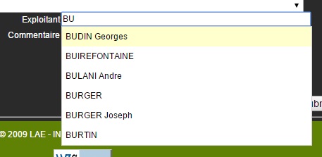 7. Saisir le nom de l’exploitant de la parcelle du relevé. L’exploitant doit être créé au préalable en tant que compte agriculteur. La saisie de l’exploitant est prédictive parmi la liste des comptes utilisateur de la base e-FLORA-sys.