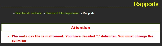 – Sélectionner le séparateur du fichier (virgule/comma ou point virgule/semi-colon). En cas de mauvais choix du séparateur, un message d’alerte s’affichera. Il est possible alors de retourner au choix du séparateur (cliquer sur ‘Statement Files Importataion) et de le modifier.