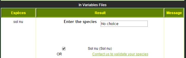 Une liste s’affiche avec toutes les espèces présentes dans le fichier d’importation. Il est nécessaire de toutes les vérifier. Plusieurs cas de figure se présentent :