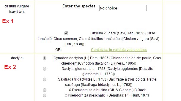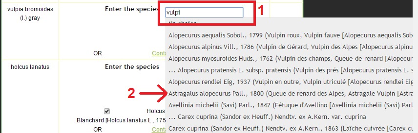 - eFLORAsys ne reconnait pas l’espèce. Saisir alors le nom de l’espèce dans la boite de dialogue et sélectionner l’espèce correspondante dans la liste déroulante qui s’affiche.