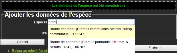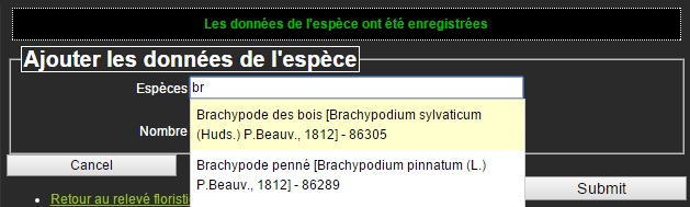 – Saisir ensuite une à une les espèces du relevé. La saisie se fait de façon prédictive via la boite de dialogue.