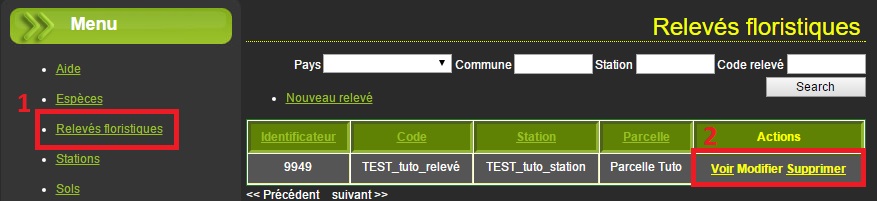 1. Après avoir cliqué sur “Relevé floristique” dans le menu à gauche, cliquer sur “Modifier” sur la ligne du relevé que vous souhaitez renseigner.
