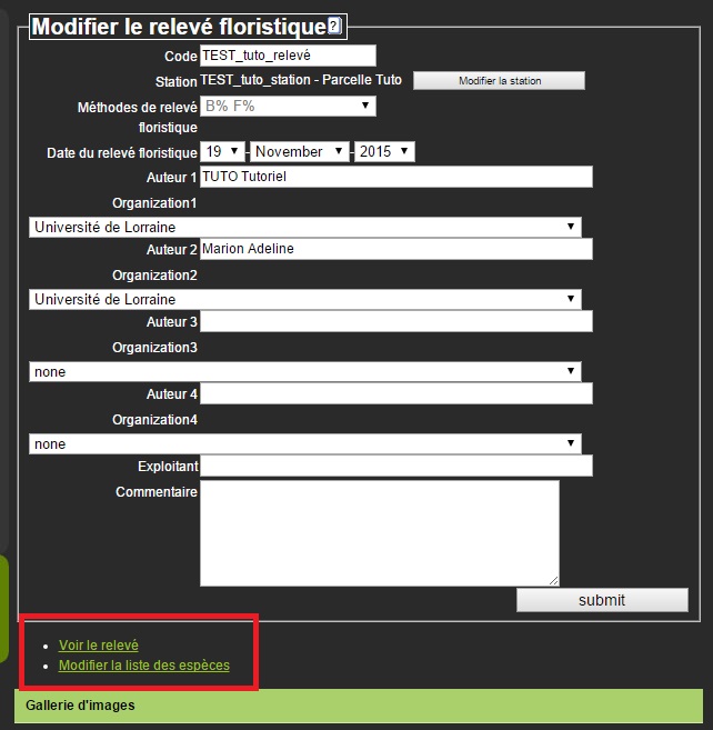 2. Cliquer sur “Modifier la liste des espèces” en bas de la nouvelle page affichée ‘Modifier le relevé floristique’
